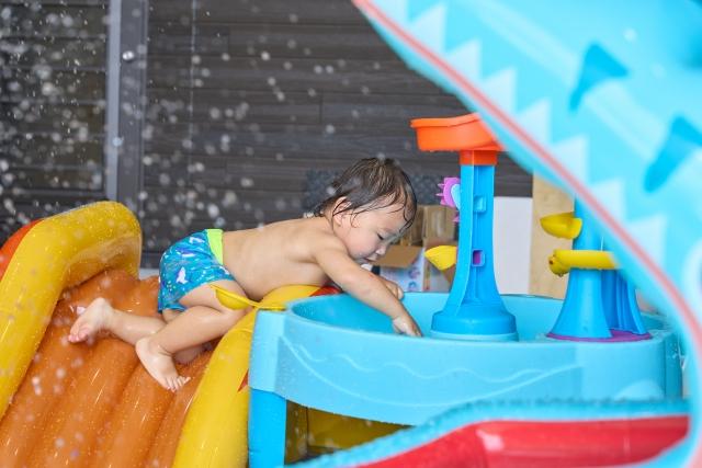 ミニプールやテントを設置して子どものあそび場に