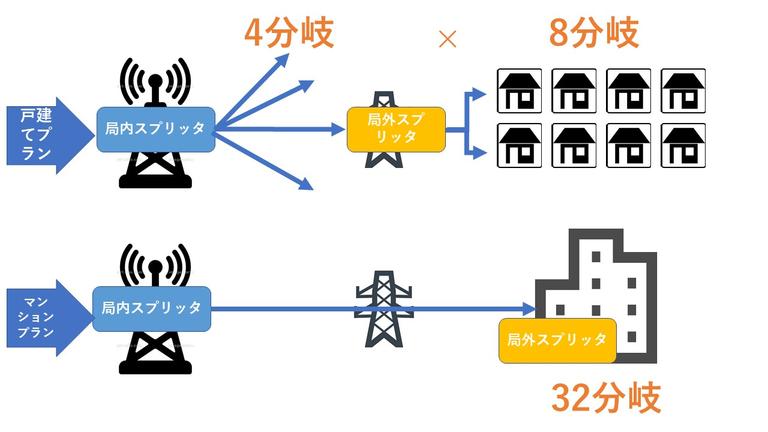 次にマンションを例にとると、同じくNTT回線の場合はマンションプランでは局内分岐をせず、局外のスプリッタで32分岐するのでマンションの場合も住戸に届くのも同じく1/32の速度となるのです。