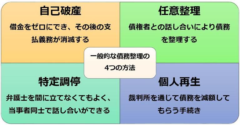 この章では、一般的な債務整理の手法である「自己破産」「任意整理」「特定調停」「個人再生」についてご紹介します。