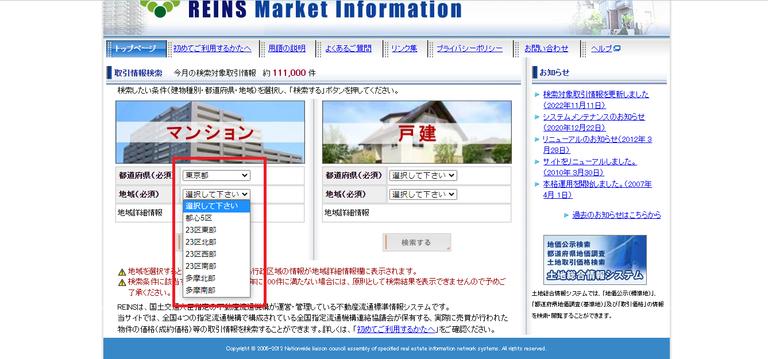 REINS Marketinformationとは、国土交通省が指定している不動産流通標準情報システムで、実際に売買された物件の成約価格など、取引情報を検索できます。