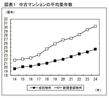 さらに下のグラフのように、中古マンションは成約物件と新規登録物件のいずれにおいても、平均築年数が年々古くなっているのが分かります。