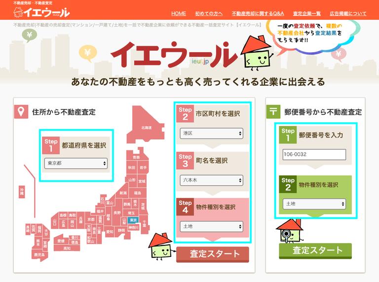 イエウールの利用者の声に「一括査定で調査することで相場より高く売ることができた!」という声があります。イエウールは、以下のように、まずはおおよその場所を入力します。