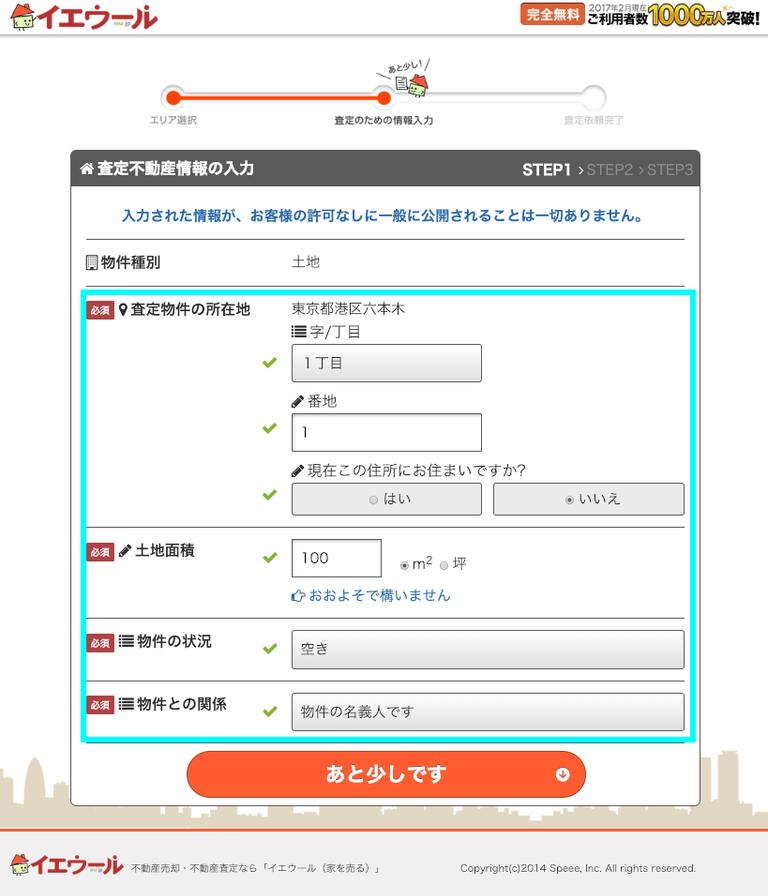 その後はこのように、土地の種別や面積などの詳細情報を入力するという流れです。