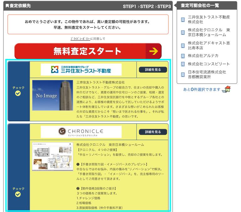 そうすると、以下のように査定依頼できる不動産会社がピックアップされます。