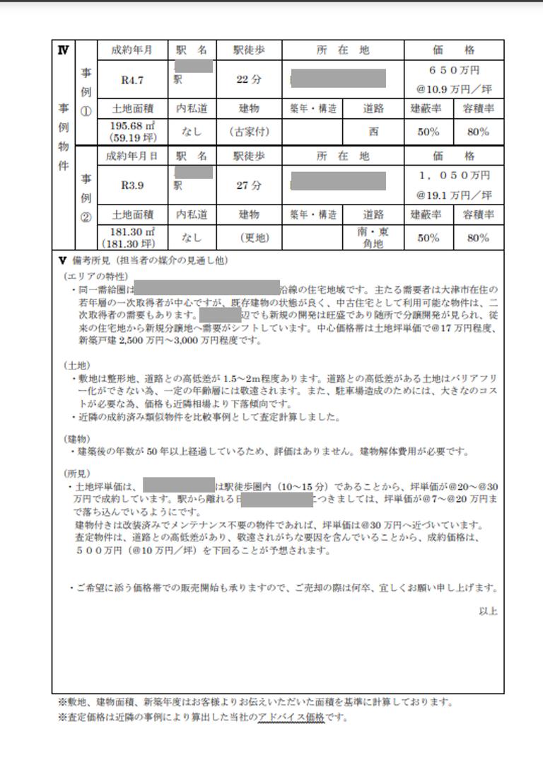 査定報告書には「過去の成約事例」「査定価格の導出方法」「エリアの特徴と評価」「解体費用がかかること」が具体的に書かれて、物件がどうやって評価されているのかつかめました。