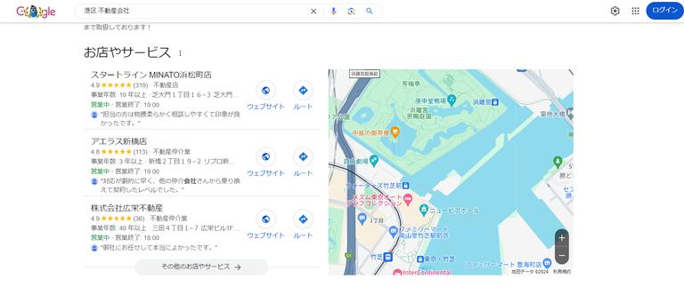 例えば「〇〇市 不動産」や「△△駅 不動産会社」といったエリア名を含む検索をすると、検索結果には地図と共に不動産会社の情報がいくつか表示されます。