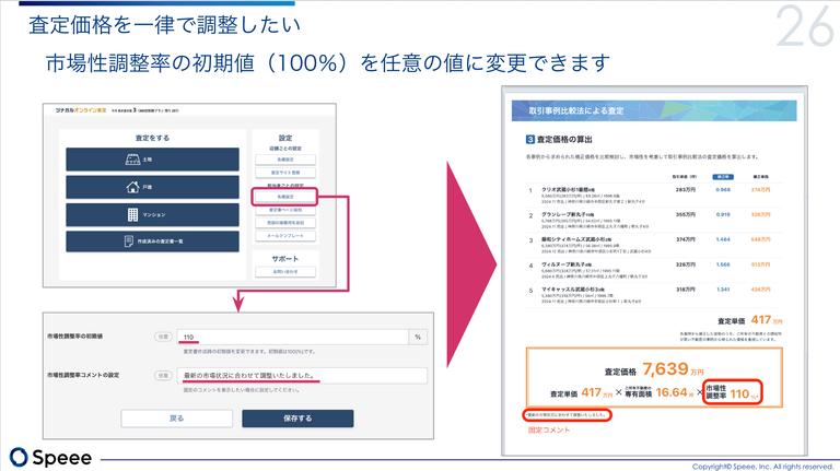 - 「市場性調整率」の初期値を110%にすることで査定書作成のたびに110%の価格で表示されます