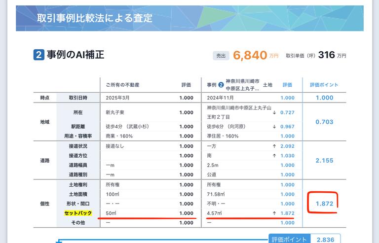 - 評価ポイントを下げるとは、一般的には評価は低いけどこのエリアにおいてはこの価格は妥当だ、より評価が高い査定事例はもっと高い価格になる、という操作になります。