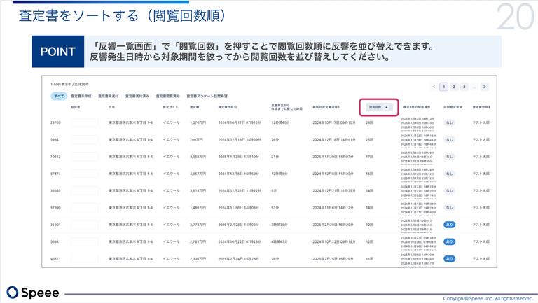 査定書の閲覧回数が多いユーザーは売却に高い関心を示しているので、そのようなユーザーに素早くアプローチできるように反響一覧で査定書の閲覧回数順に並び替えできるようにしました。